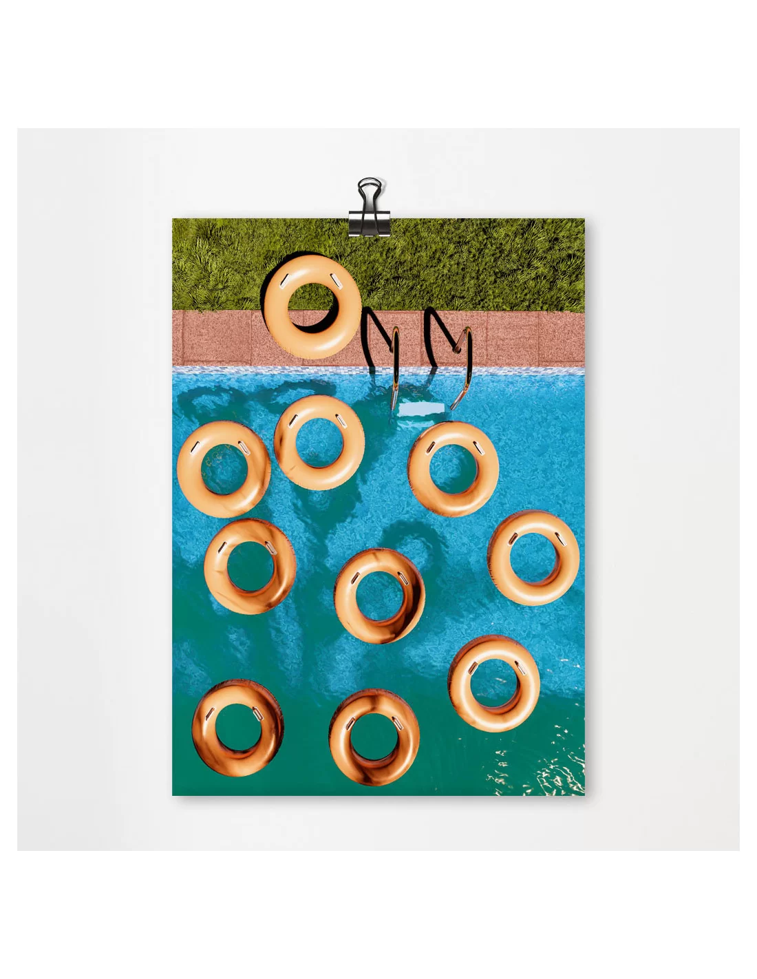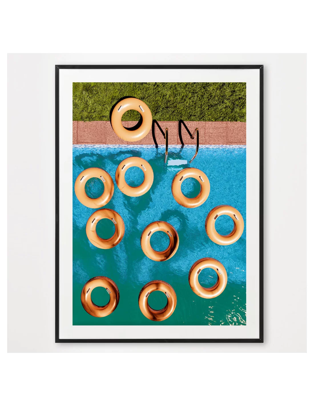 Le contraste entre le orange vif des bouées et le bleu cristallin de la piscine donne à la scène une profondeur visuelle. Leur présence massive pourrait symboliser un excès de prudence, ou, à l'inverse, une folie joyeuse où la sécurité est le prétexte d'une extravagance. Ces bouées, si ordinaires dans leur fonction, sont ici transformées en protagonistes d'un tableau vivant et joyeux.