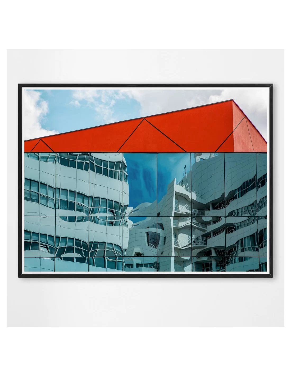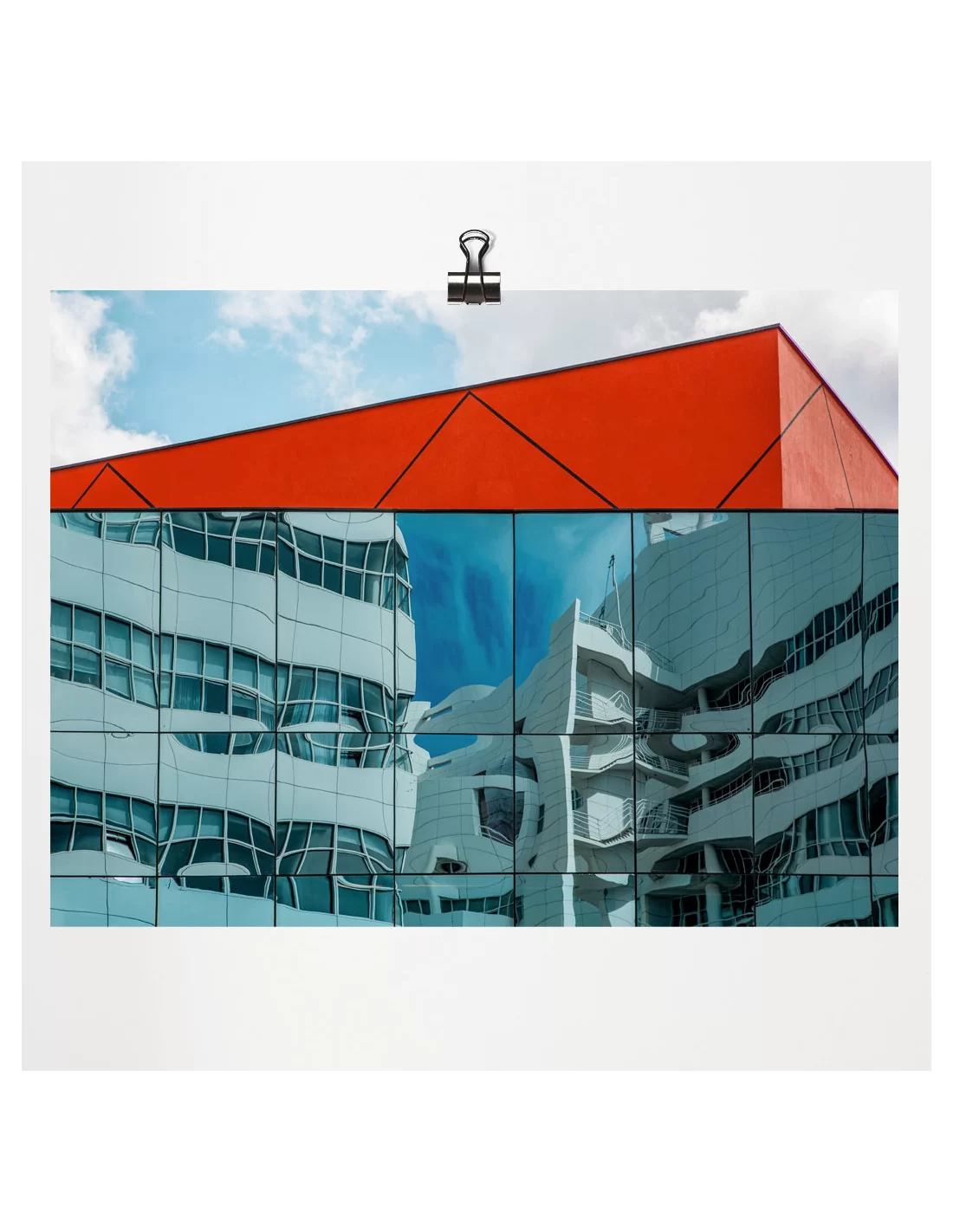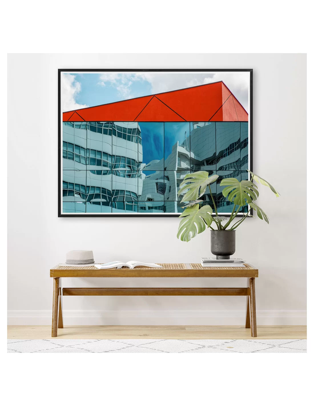 Contrastant avec le rouge audacieux, le ciel bleu qui apparaît au-dessus offre un moment de repos pour les yeux. Il rappelle que, malgré le rythme effréné et souvent chaotique de la vie urbaine, il existe toujours un espace pour la paix, la réflexion et la beauté simple. Ce ciel bleu agit comme un rappel de l'infini et de l'éternel, contrastant magnifiquement avec les constructions éphémères et changeantes de l'homme en dessous.